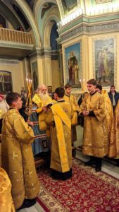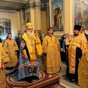 Его Высокопреосвященству сослужили: секретарь Барнаульской епархии архимандрит Иларион (Морозов), заведующий Регентской школой при Барнаульской духовной семинарии протоиерей Максим Спиненко, а также духовенство собора.