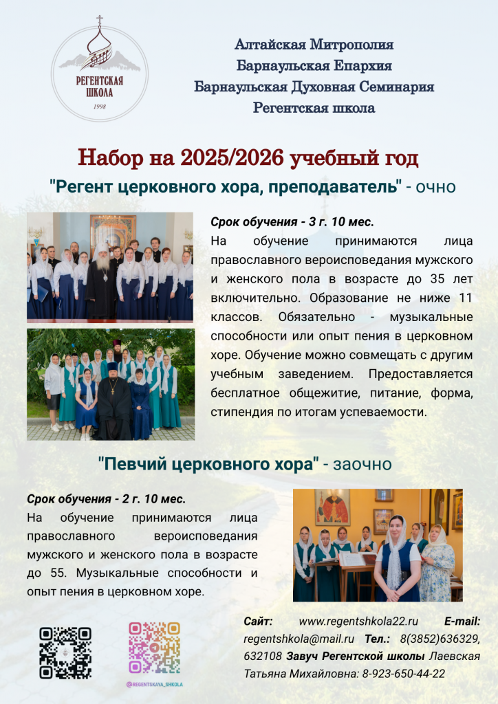 Документы принимаются с 16 июня по 15 августа 2025 года либо на электронную почту Регентской школы по адресу: regentshkola@mail.ru или их можно принести лично по адресу г. Барнаул, пер. Ядринцева, 66 — канцелярия Барнаульской духовной семинарии.